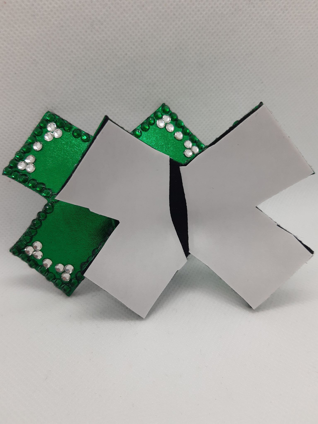 Rastin muotoiset tasselit. EI tupsuja. Metallinhohtounen vihreä pohja. Tausta musta pehmeä huopa. Uniikki käsityö.