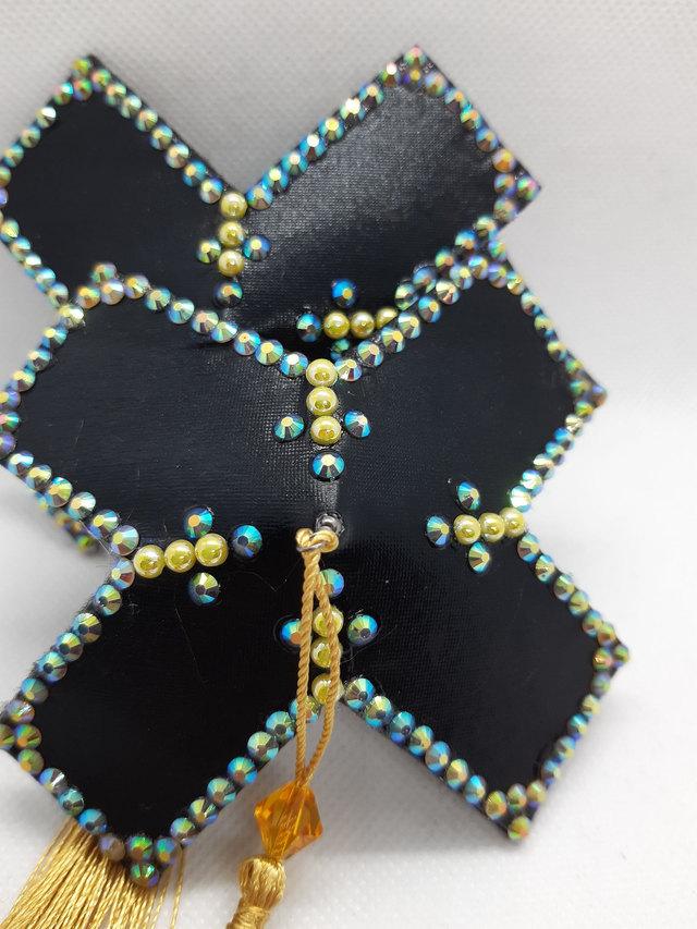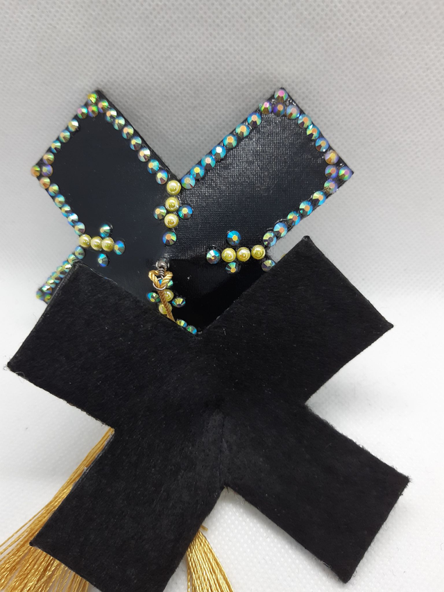 Rastin muotoiset tasselit. Musta ´latex´pohja, kultainen tupsu. Koko M, pisimmillään 10cm , lyhimmillään 4,5cm. Taustalla musta pehmeä huopa. Uniikki käsityö. Tuote pakataan FSC-sertifioituun kartonkipakkaukseen, jota voi jatkossa käyttää tasseleiden/korujen säilytysrasiana. Käytämme muutoinkin tuotteiden valmistuksessa paljon kierrätysmateriaaleja