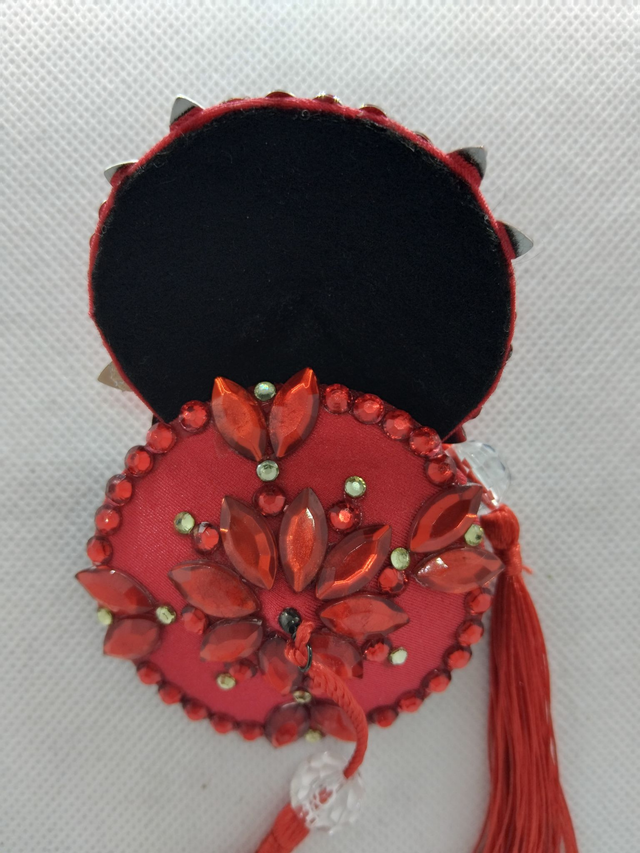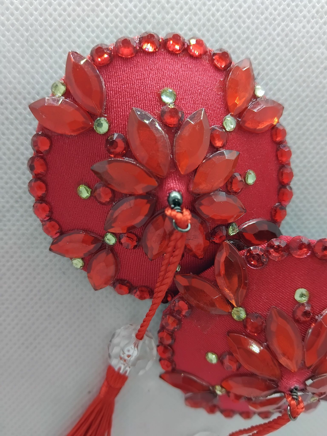 Punaisin ja kirkkain strassein koristeltu, punaiset tupsut. Koko S, 5,5cm. Taustalla musta pehmeä huopa. Uniikki käsityö.