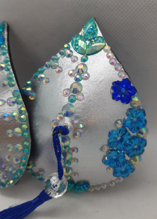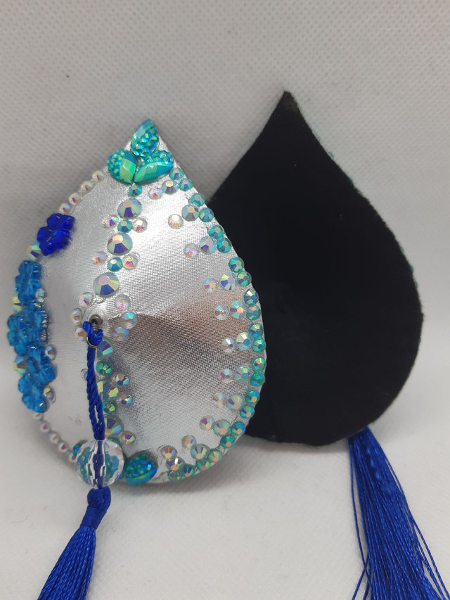 Pisaranmuotoiset tasselit, hopeisella pohjalla ja sinisillä tupsuilla. Koko M, 7x9cm. Taustalla musta pehmeä huopa.