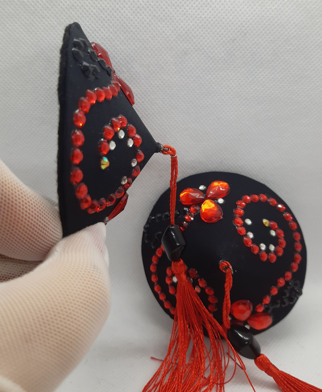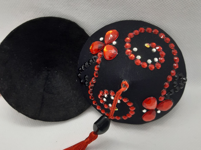 Musta-punaiset tasselit, punaisella tupsulla. Koko M, 8cm. Huom! Korkea Madonna-malli. Taustalla musta pehmeä huopa.