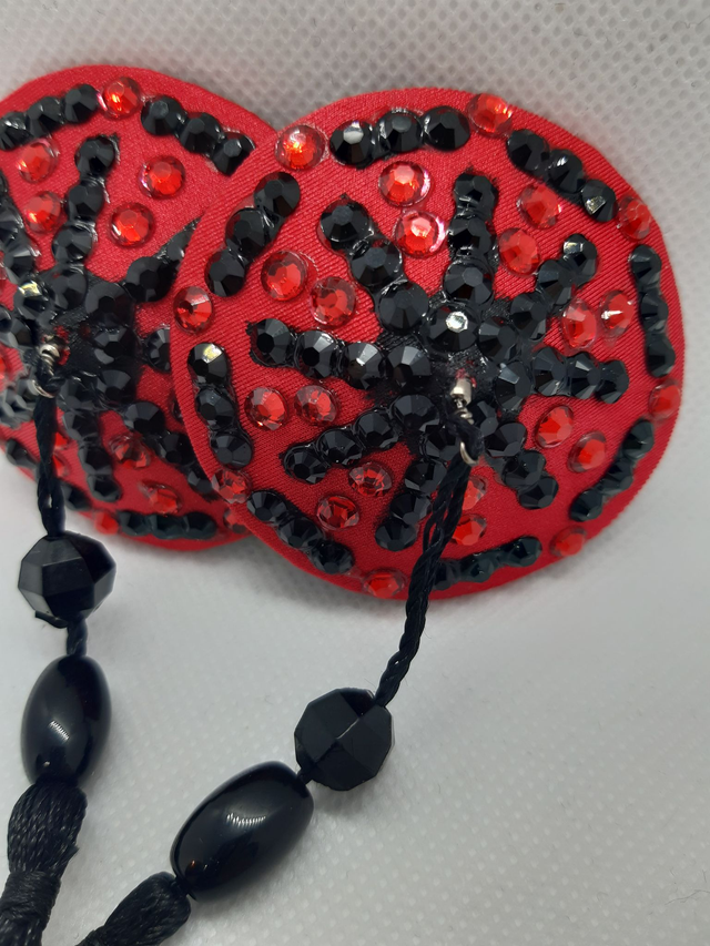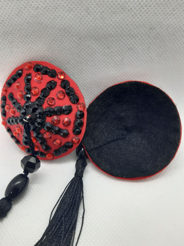 Tasselit koko S, 5,5cm. Tupsut mustat. Taustalla musta pehmeä huopa. Uniikki käsityö.