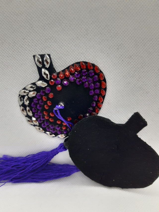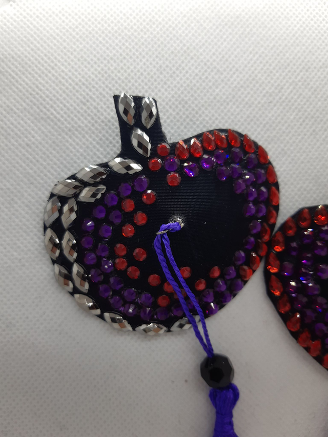 Omenan muotoiset tasselit, violetilla tupsuilla (kuva vääristää väriä). Koko S, ~5x7cm. Taustalla musta pehmeä huopa. Uniikki käsityö. Tuote pakataan FSC-sertifioituun kartonkipakkaukseen, jota voi jatkossa käyttää tasseleiden/korujen säilytysrasiana. Käytämme muutoinkin tuotteiden valmistuksessa paljon kierrätysmateriaaleja