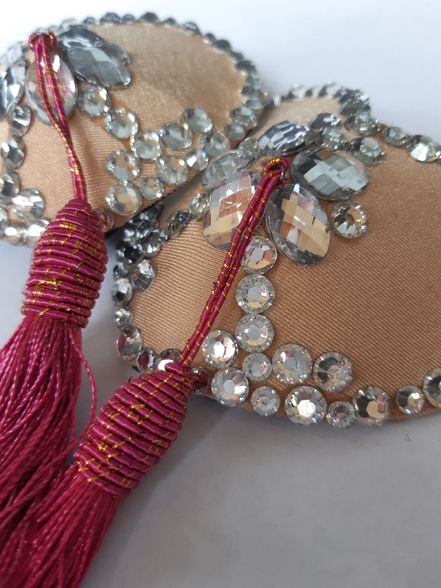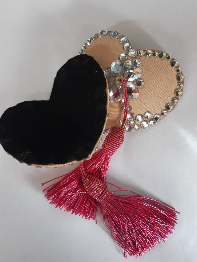 Nude värinen sydäntasseli, tupsut paksut pinkit (tupsut tuotu Versaillesin palatsista, Pariisista) Koko M, 8x6cm. Taustalla musta kovetettu huopa. Tuote pakataan FSC-sertifioituun kartonkipakkaukseen, jota voi jatkossa käyttää tasseleiden/korujen säilytysrasiana. Käytämme muutoinkin tuotteiden valmistuksessa paljon kierrätysmateriaaleja