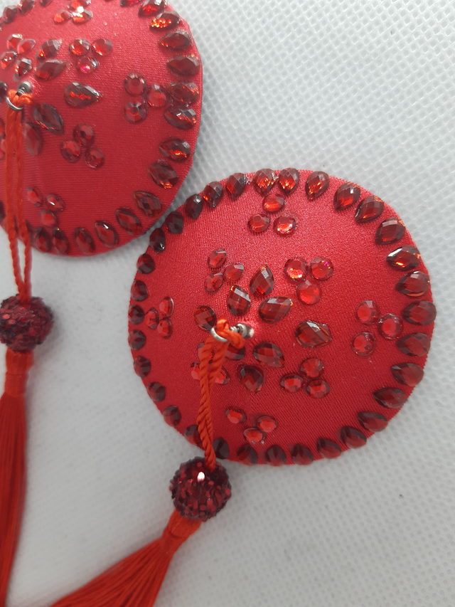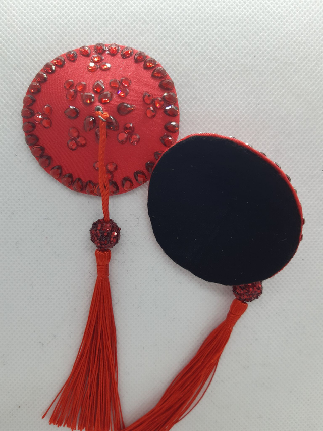 Koko S, 5,5cm. Tupsut punaiset. Tausta musta pehmeä huopa. Uniikki käsityö.