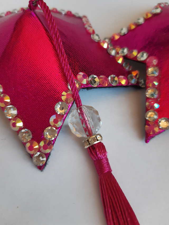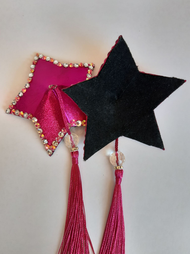 Fuxian väriset tähdenmuotoiset tasselit, fuxian värisillä tupsuilla. Koko M, ~6cm. Taustalla musta kovetettu huopa.
