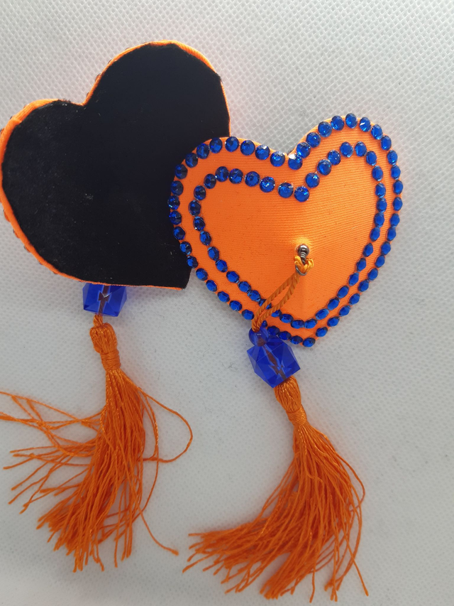 Sydämenmuotoinen tasseli, oranssit tupsut. Koko S, 5,5x5cm. Tausta musta pehmeä huopa. Uniikki käsityö.