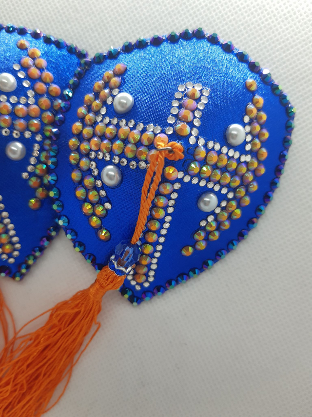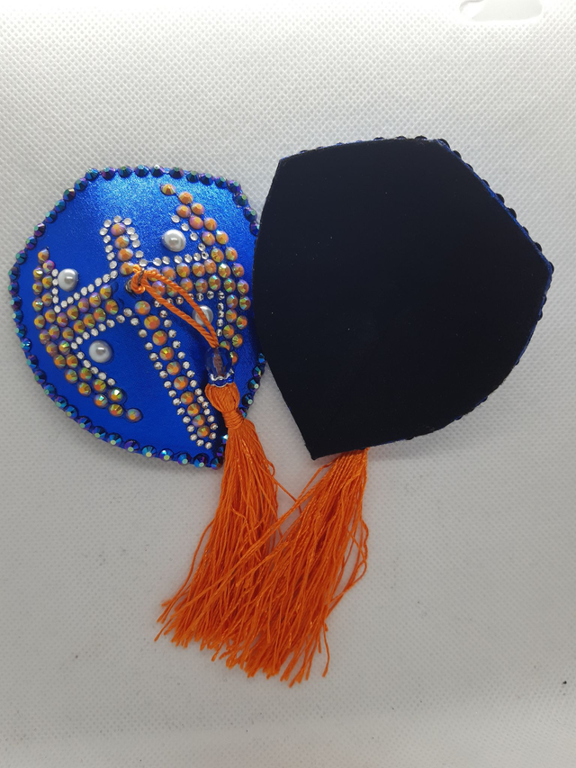 Metallinhohtosininen pohja, oranssit tupsut. Koko M, 8x7cm. Taustalla musta pehmeä huopa. Uniikki Käsityö. Tuote pakataan FSC-sertifioituun kartonkipakkaukseen, jota voi jatkossa käyttää tasseleiden/korujen säilytysrasiana. Käytämme muutoinkin tuotteiden valmistuksessa paljon kierrätysmateriaaleja