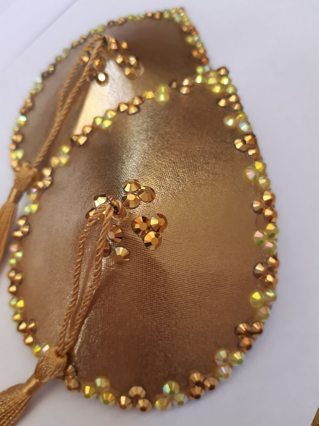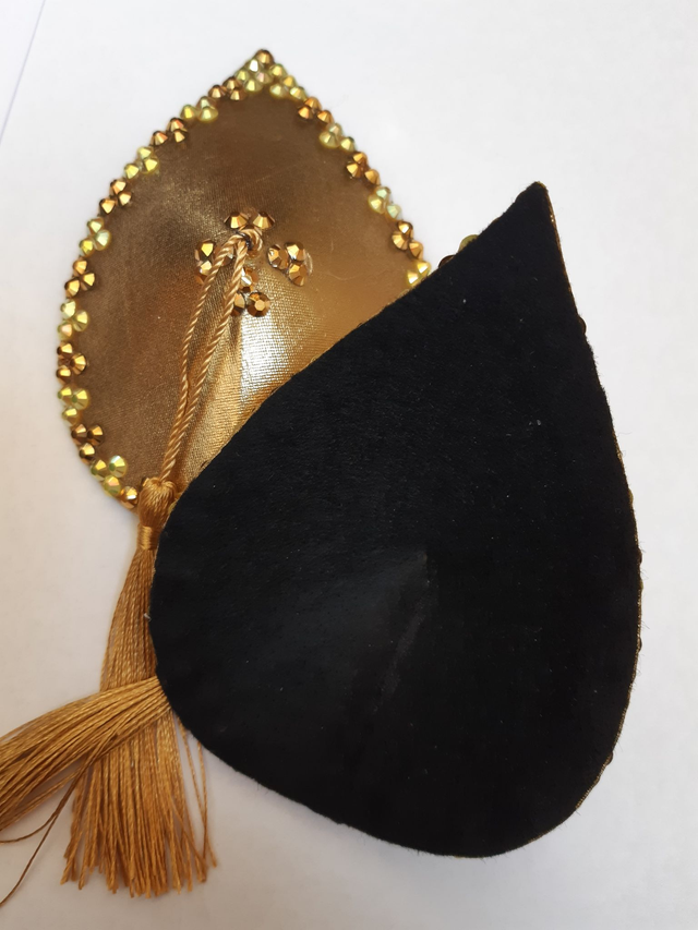 Kultaiset pisaranmuotoiset tasselit. Koko L, 8x11cm. Taustalla musta huopa. Kultaiset tupsut. Uniikki käsityö.