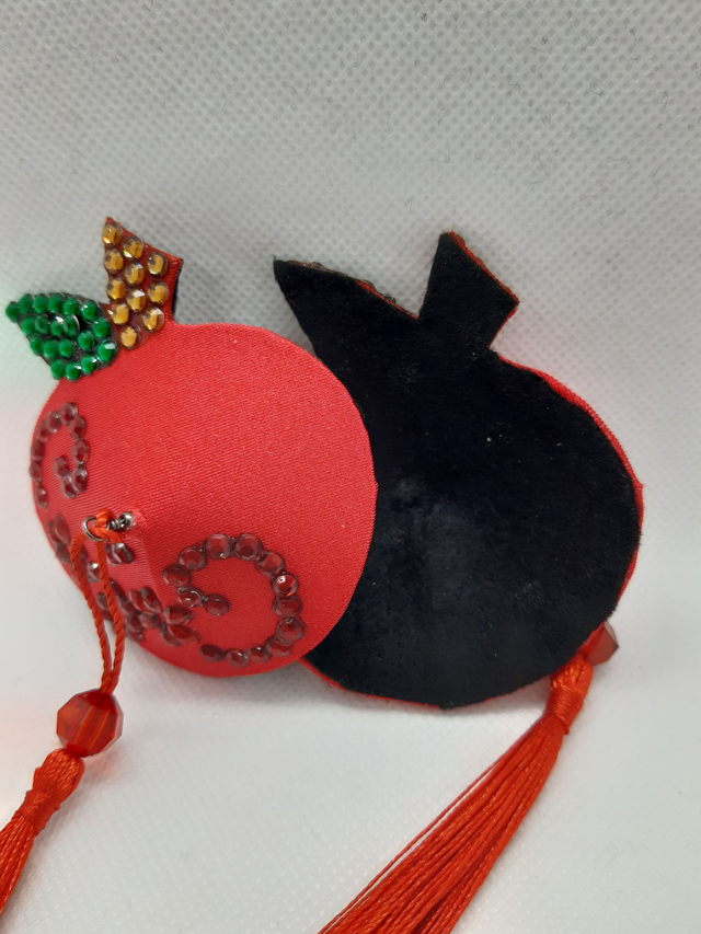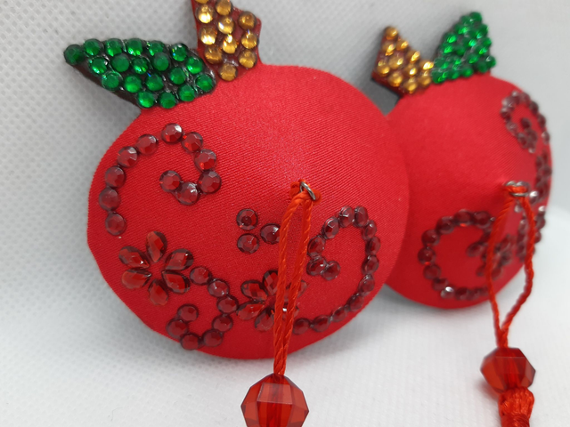 Omenan muotoiset tasselit, punaisilla tupsuilla. koko S, 6x5,5cm. Taustalla musta pehmeä huopa. Uniikki käsityö.