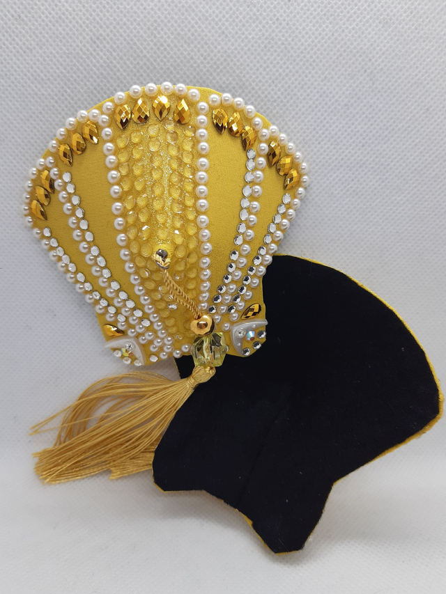 Simpukankuoren muotoiset tasselit, kultaiset tupsut. Koko M, 8x7cm. Taustalla musta pehmeä huopa. Uniikki käsityö.