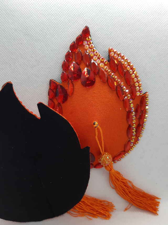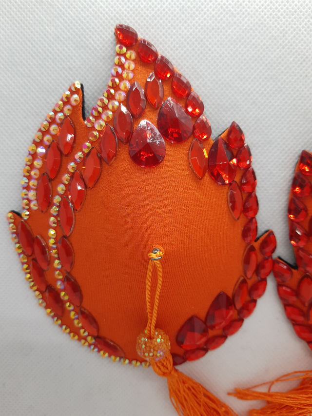 Liekin muotoiset tasselit oranssilla tupsulla. Koko L, 9-12,5cm. Taustalla musta pehmeä huopa. Uniikki käsityö.