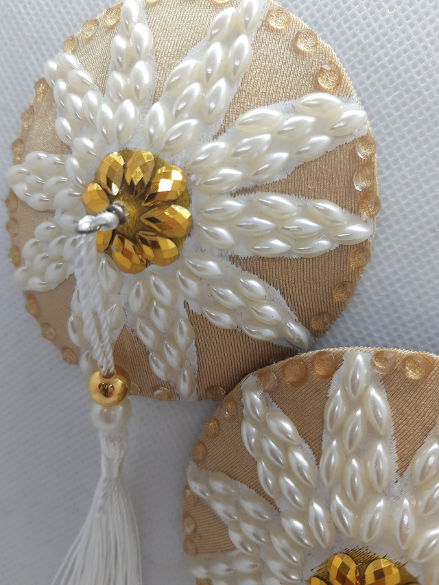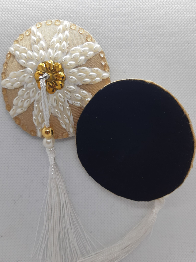 Nudepohjalla helmin koristeltu tasseli. Valkoiset tupsut. Koko M, 7cm. Musta pehmeä huopa taustalla. Uniikki käsityö.