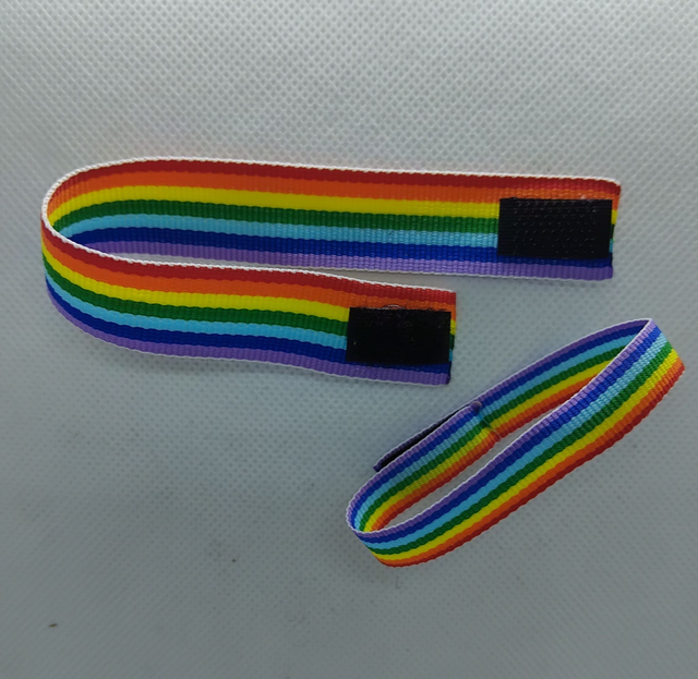 Pride ranneke sateenkaaren väreissä. Materiaali kangasta, kiinnitys tarranauhalla. Ranneke ei veny.