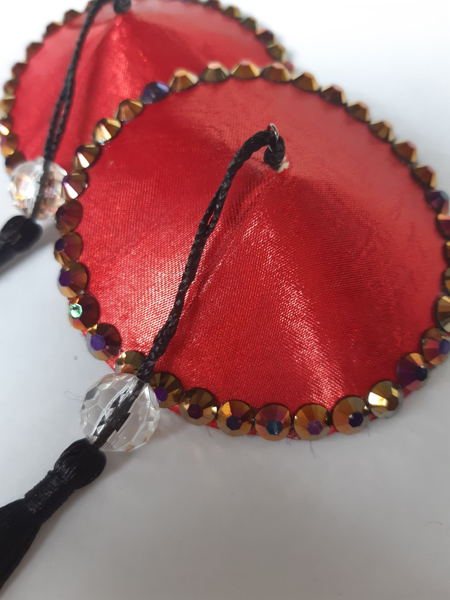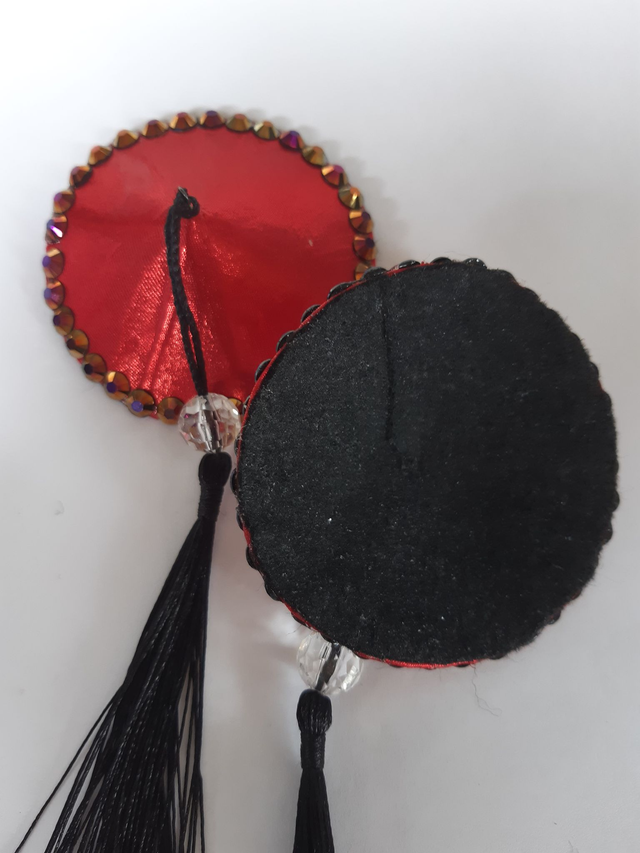 Punaiset pyöreät tasselit, mustilla tupsuilla. Koko M, 7cm. Taustalla musta huopa. Uniikki käsityö. Tuote pakataan FSC-sertifioituun kartonkipakkaukseen, jota voi jatkossa käyttää tasseleiden/korujen säilytysrasiana. Käytämme muutoinkin tuotteiden valmistuksessa paljon kierrätysmateriaaleja