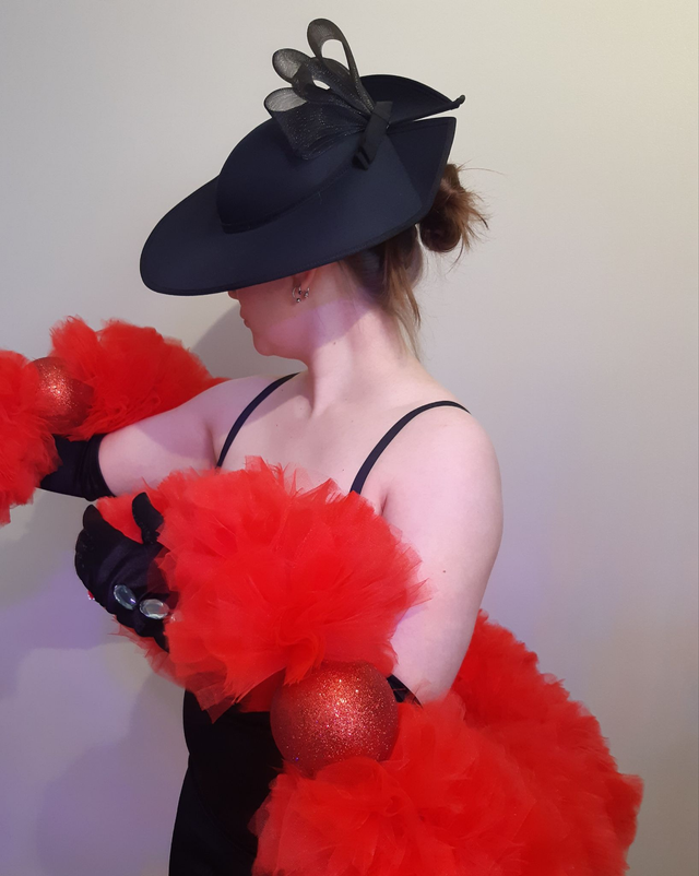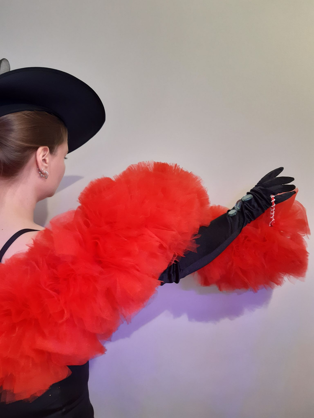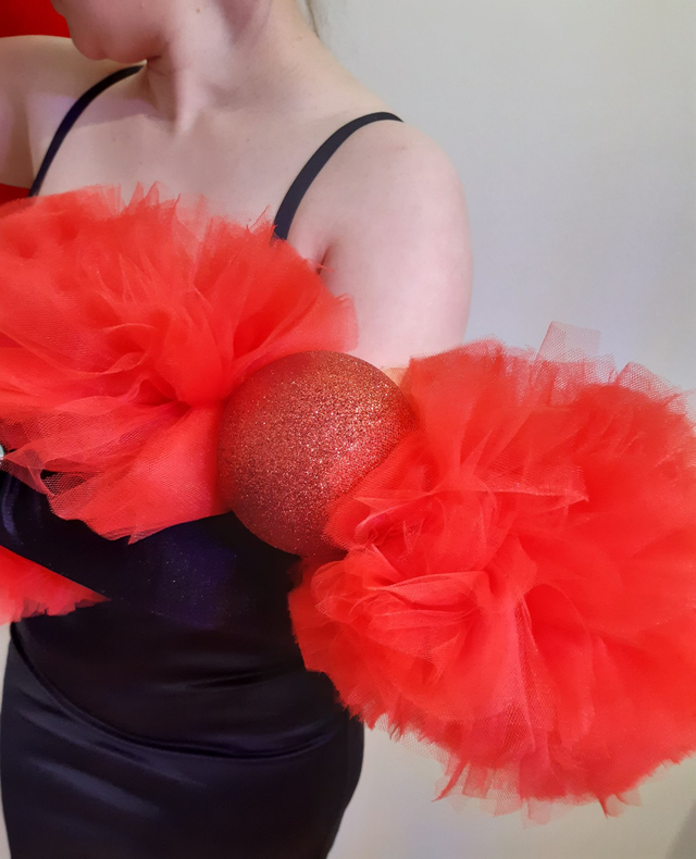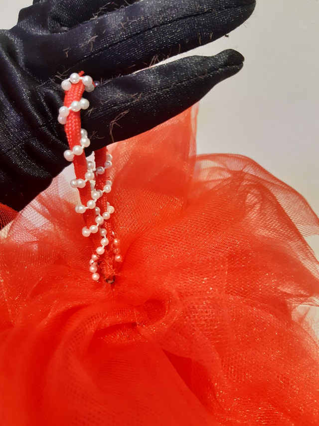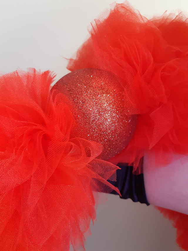 Punainen tyllipuuhka. Kuvan väri vääristää, tuote on kirkkaan punainen. Pituus 2metriä, paksuus 20cm. 2x kimallepallo koristeena, pallon halkaisija 10cm. Sormilenkit. Toimitetaan kuljetuskassissa.