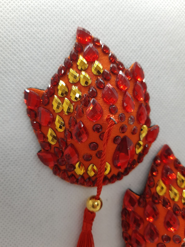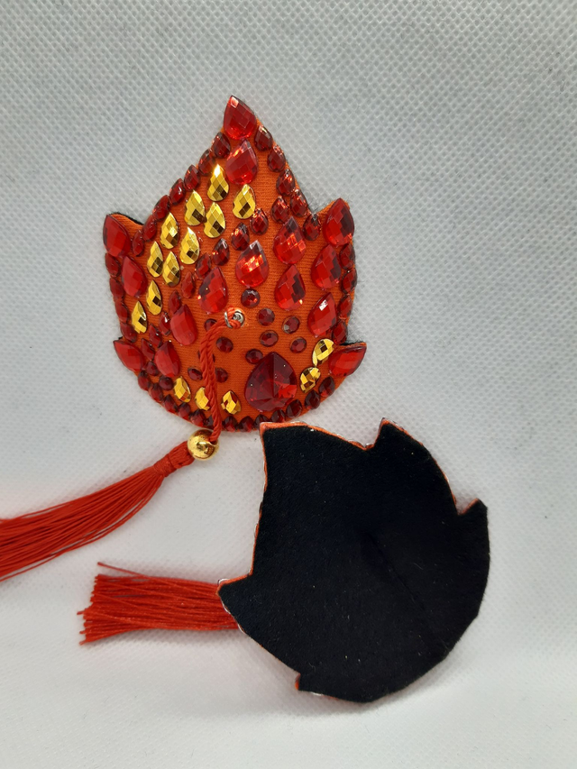 Liekin muotoiset tasselit punaisilla tupsuilla. Koko S, ~5x6cm. Taustalla musta pehmeä huopa. Uniikki käsityö.