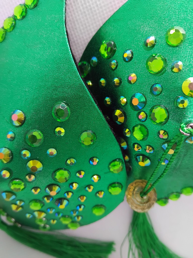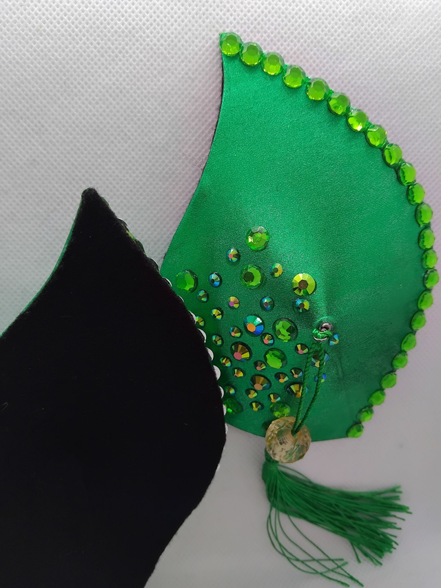 Lehden muotoiset tasselit. Metallihohtoinen vihreä pohja, vihreät tupsut. Koko L, 9x12cm. Taustalla musta pehmeä huopa.