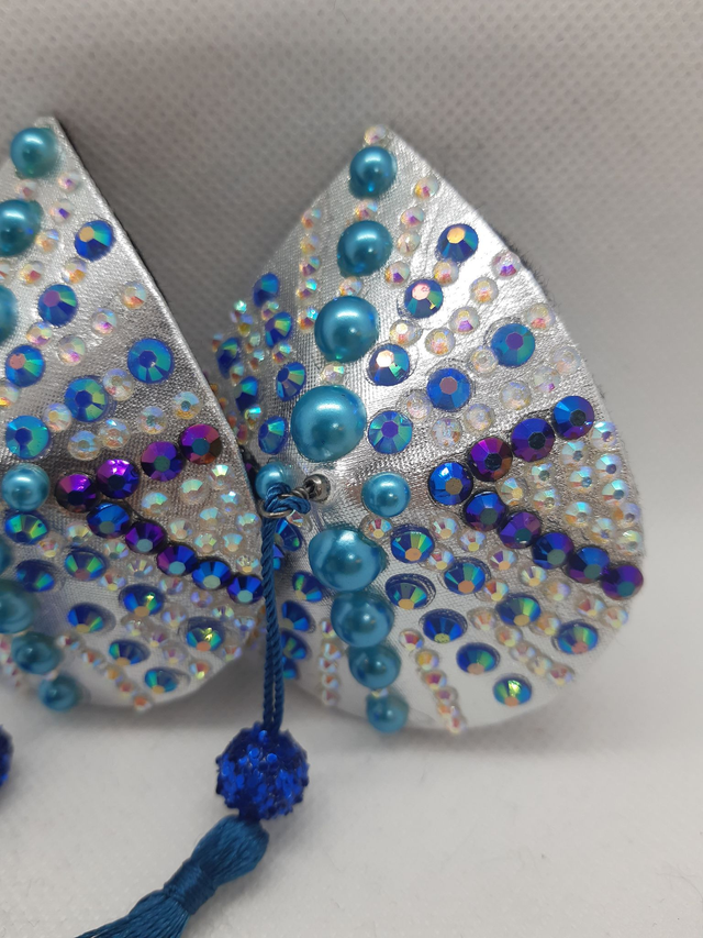 Pisaranmuotoiset tasselit, petroolin värisillä tupsuilla. Koko S, 6x7cm. Taustalla musta pehmeä huopa. Uniikki käsityö.