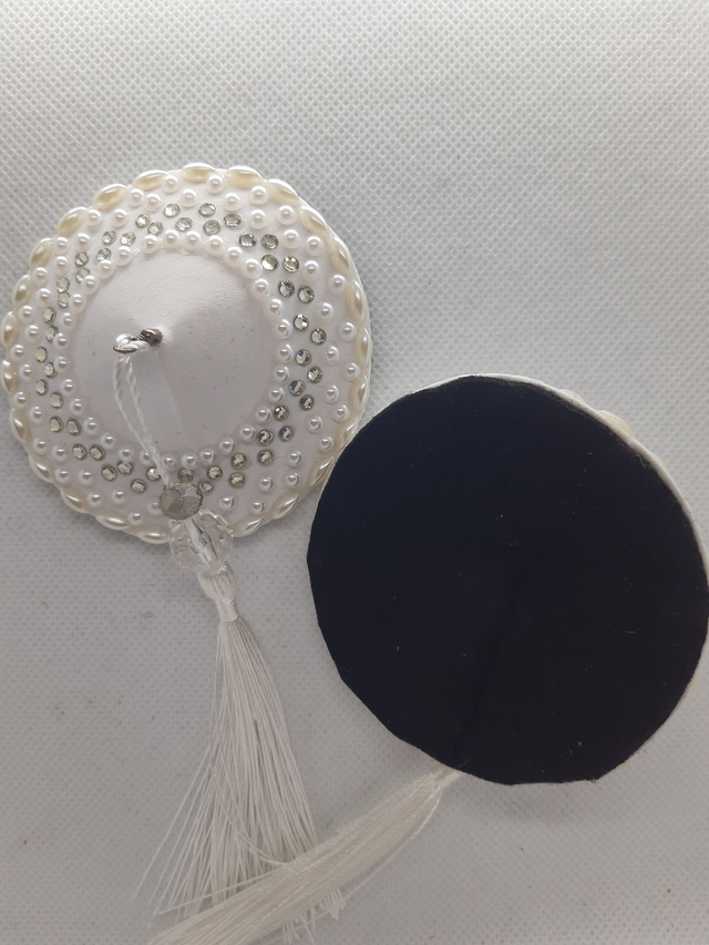 Valkoiset pyöreät tasselit, valkoisilla tupsuilla. Koko M, 7cm. Taustalla musta pehmeä huopa. Uniikki käsityö.
