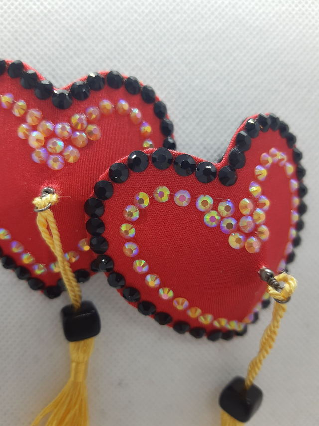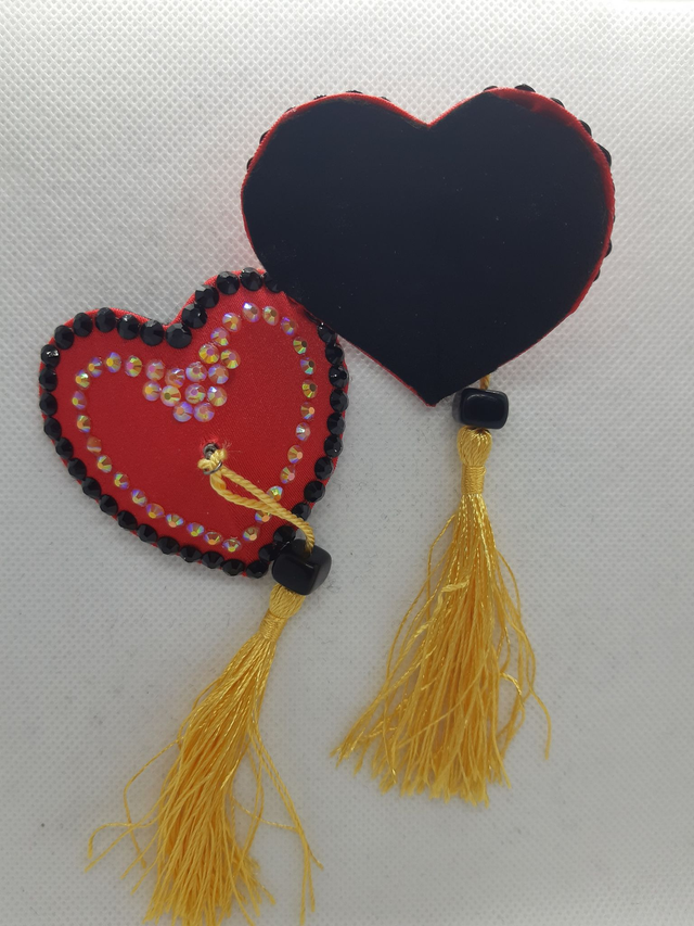 Sydämen muotoiset tasselit. Keltaiset tupsut. Koko S, 6x5cm. Taustalla musta pehmeä huopa. Uniikki käsityö.