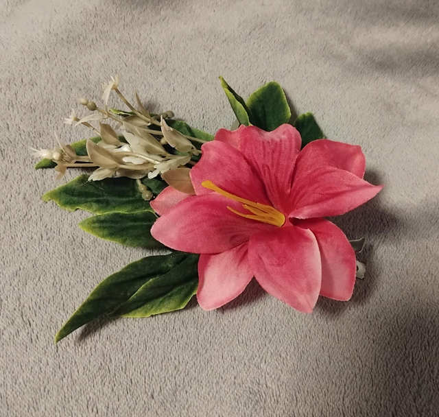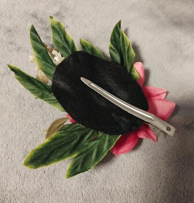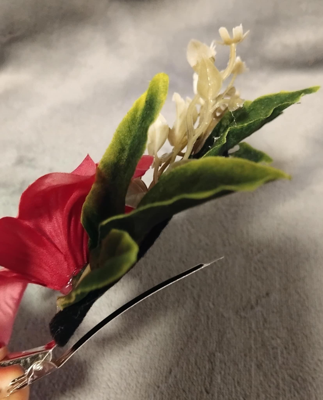 Hiuskoriste, vaaleanpunainen vihreillä lehdillä. Hiusklipsikiinnitys, klipsi 9cm. Silkkikukka, koristeena valkoisia vihneitä jotka ovat muovia. Kukan halkaisija 10cm, kokonaisuuden pituus n.15cm. Koristetta voi käyttää myös takin/puseron kauluksessa tai taskun syrjässä.