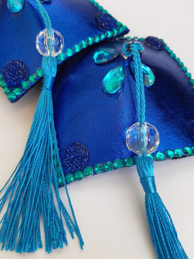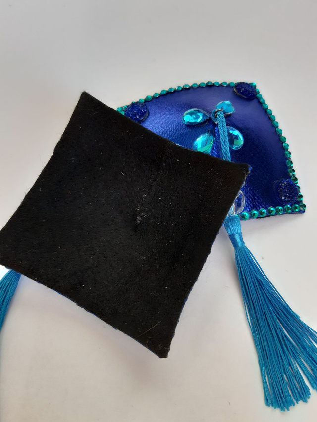 Metallinhohto sininen neliömäinen tasseli. Siniset tupsut. koko M, 7x7cm. Taustalla musta kovetettu huopa. Uniikki käsityö.