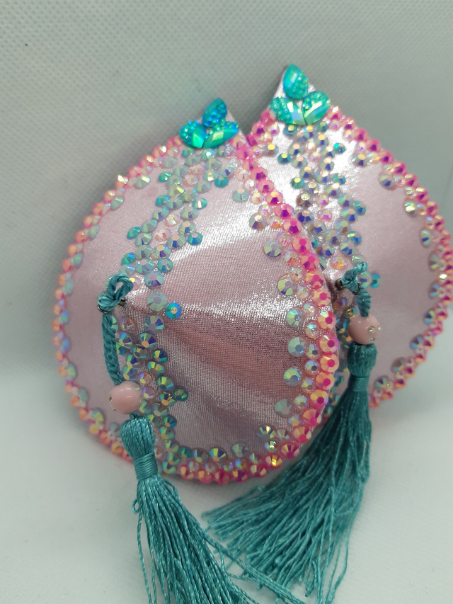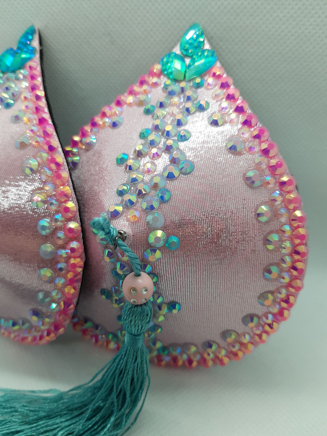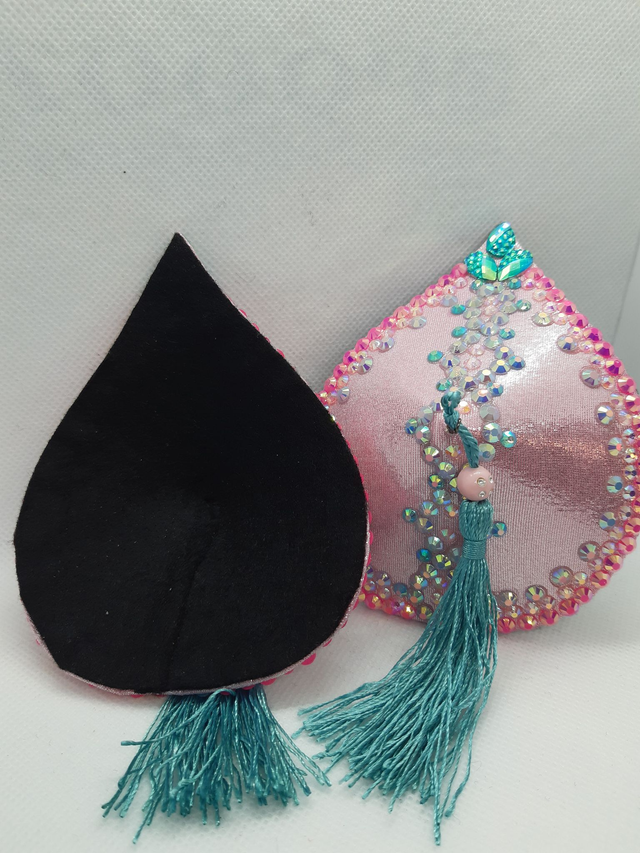 Pisaranmuotoinen tasseli, pinkki pohja, vedenvärinen tupsu. koko L, 8,5x10cm. Taustalla musta pehmeä huopa,