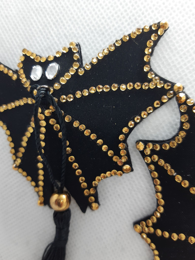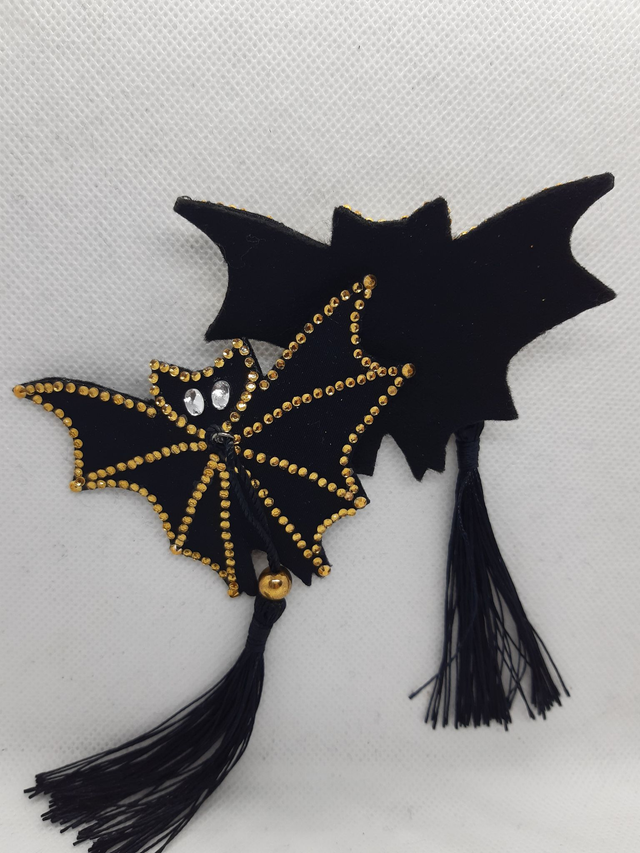 Lepakon muotoiset söpöt tasselit, mustilla tupsuilla. Koko S, ~6x4cm. taustalla musta pehmeä huopa. Uniikki käsityö.